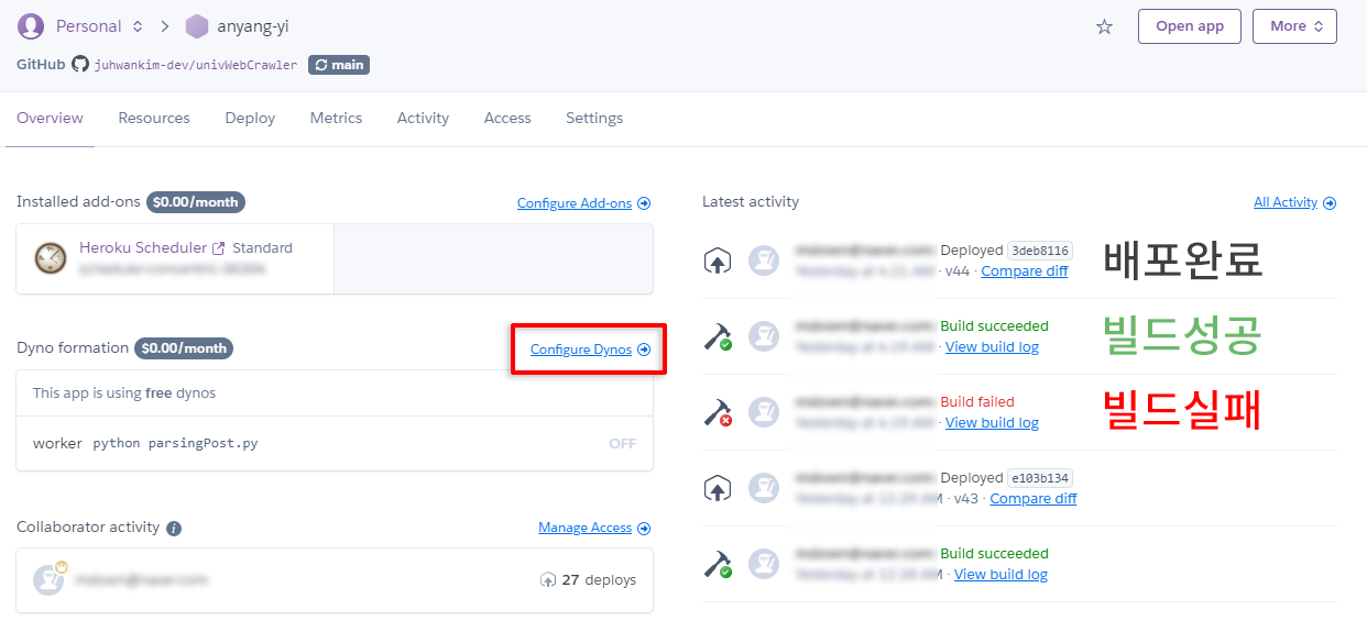 배포를 완료했다면 Overview로 이동해서 Configure Dynos를 클릭하자.