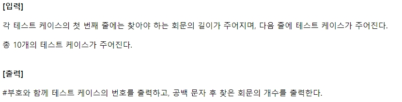 회문의 첫 번째 글자 좌표, 회문의 길이, 포문 이렇게 3가지만 있으면 회문 검사를 할 수 있다.