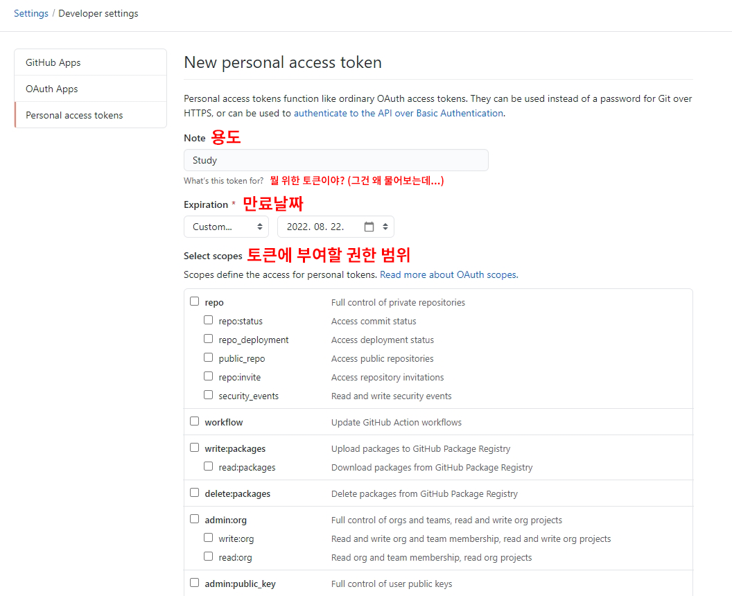 그리고 그 밑에는 토큰에 부여할 권한들을 선택하는 옵션들이다.