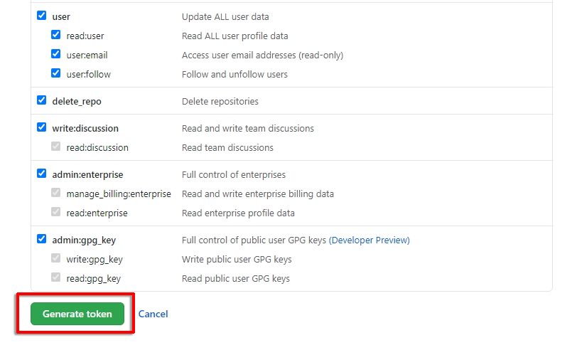 스크롤을 더 밑으로 내리면 Generate token 버튼이 보인다.