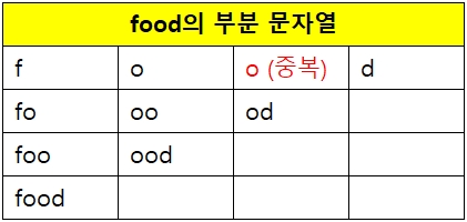 food의 경우 'o'가 두 번 나와서 부분 문자열의 총개수는 9개가 된다.