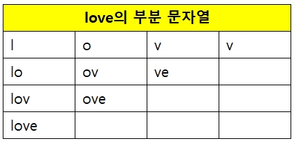 위 표에 있는 접미사들이 만들어 낼 수 있는 부분 문자열을 아래에 작성해 보았다.