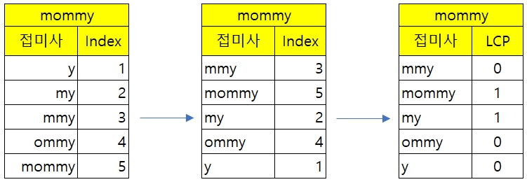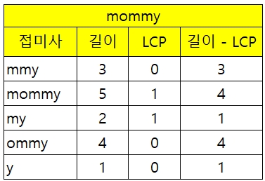 mommy로 접미사 배열과 LCP 배열을 만들면 위 표처럼 될 것이다.