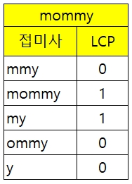 mommy로 접미사 배열과 LCP 배열을 만들면 위 표처럼 될 것이다.