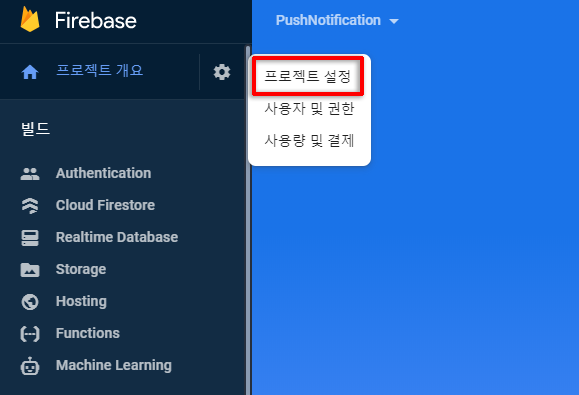 파이어 베이스 서버 키를 얻기 위해서 위 경로대로 클릭한다.