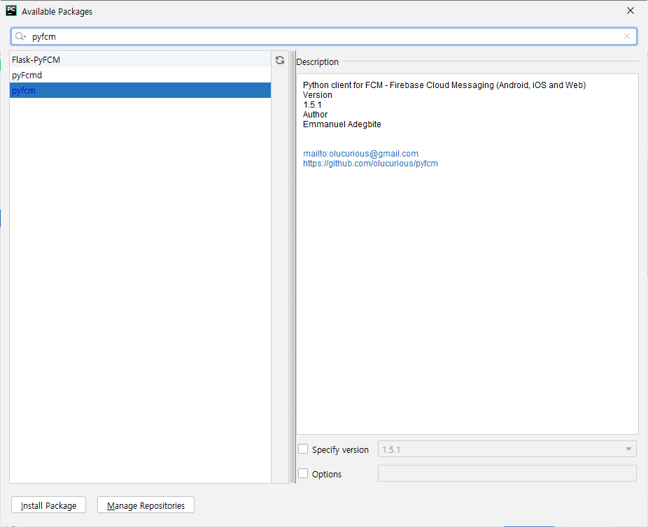 커맨드에서 "pip install pyfcm"을 입력해서 라이브러리를 설치해도 되지만