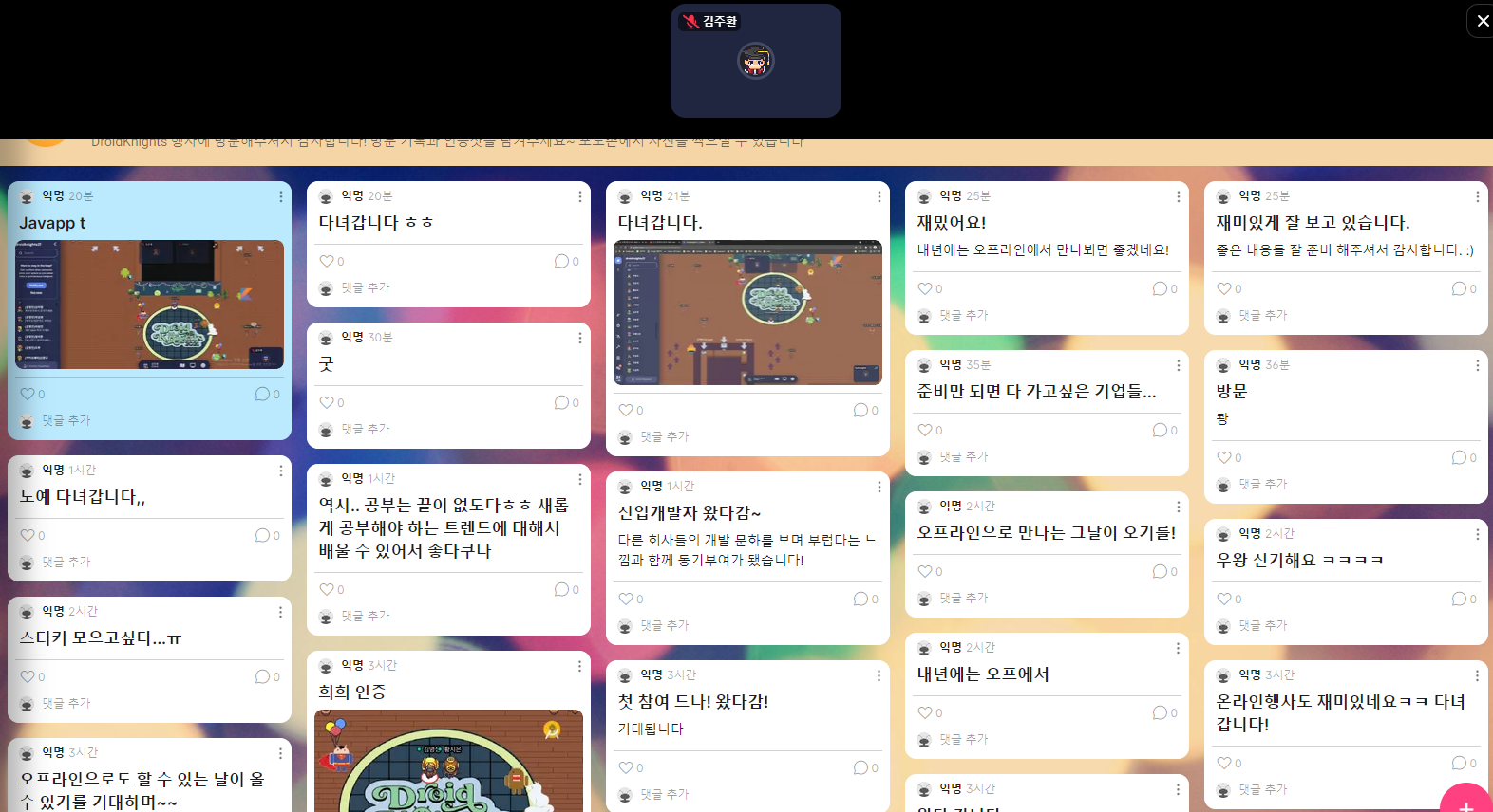 👩🏻💻, 👨🏻💻: 네 그러니까 이번 안드로이드 어쩌구 저쩌구.. $%#@. 어? 김주환님 안녕하세요 반가워요!