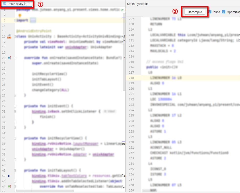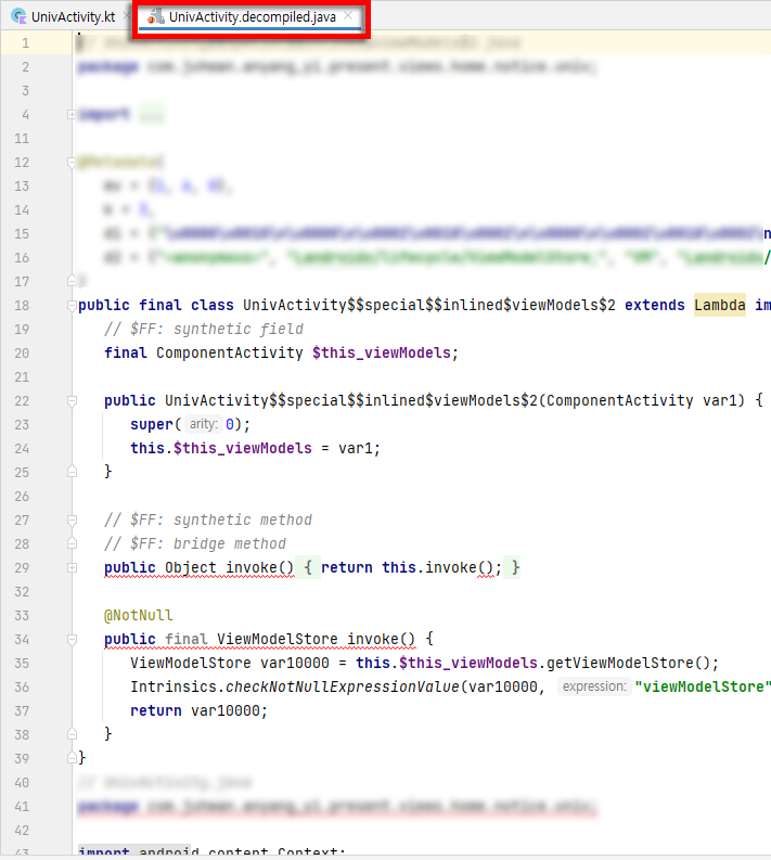 Kotlin으로 되어있던 코드를 Java 코드로 볼 수 있다.