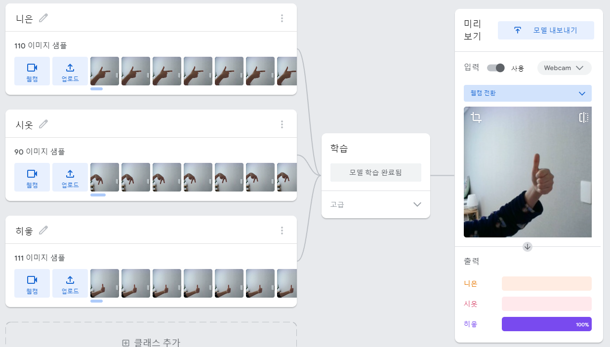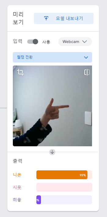 학습이 완료되면 위 사진처럼 캠으로 어떤 동작을 하면