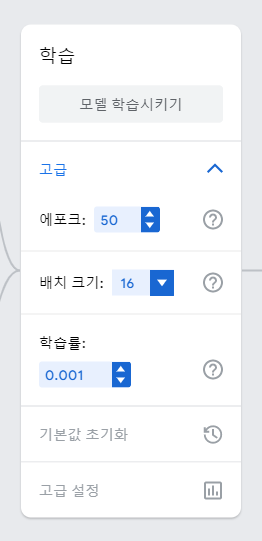 에포크, 배치 크기, 학습률을 조절할 수 있는데 각 설정이 무엇을 의미하는지는 우측에 있는 물음표에 커서를 대면 설명이 나온다.