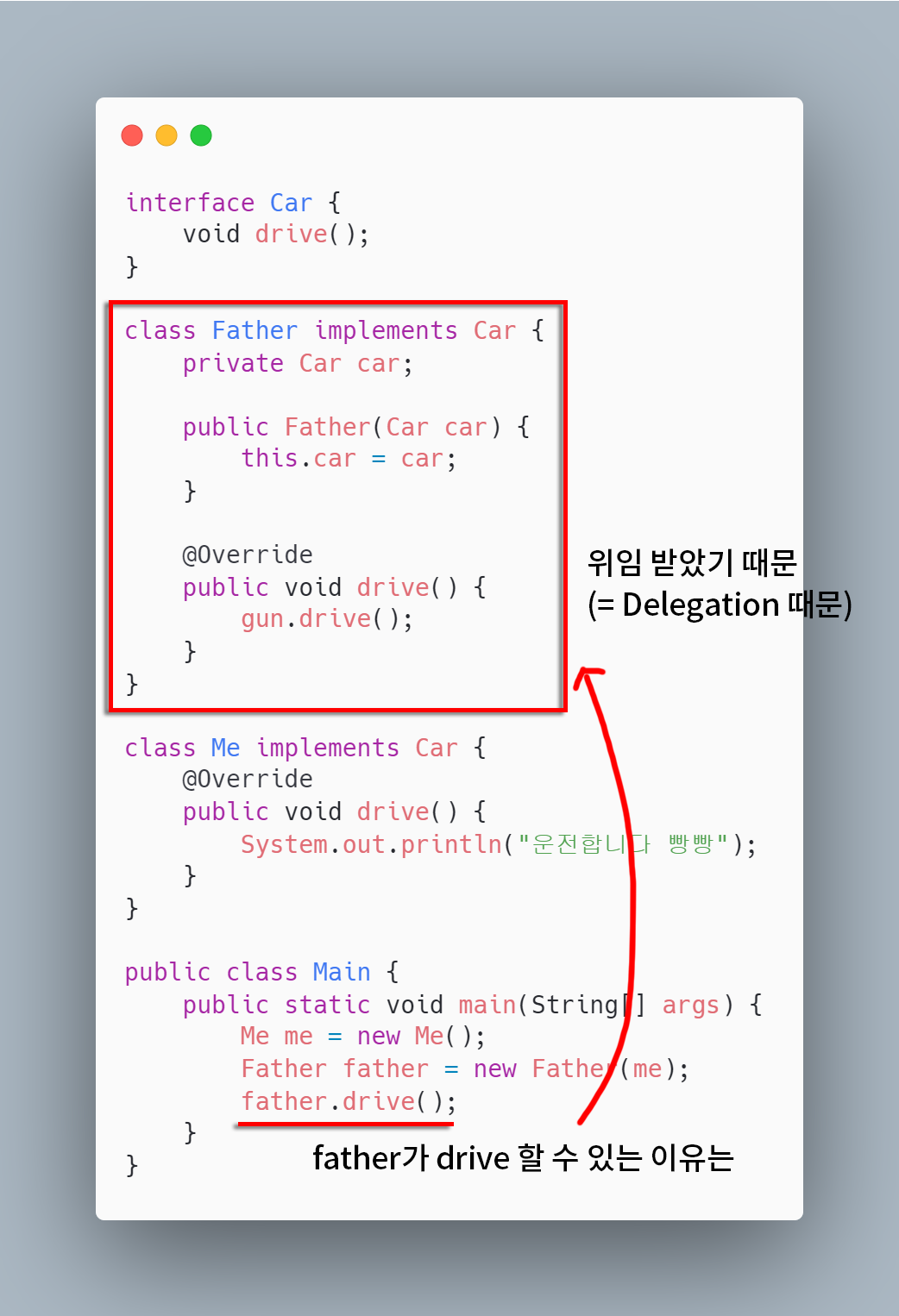 (= Father에게 Me가 구현한 Car의 메서드를 위임함으로써 Father가 drive를 호출할 수 있다)