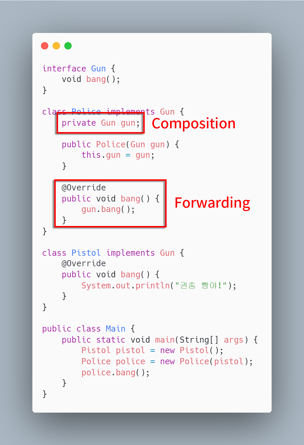 위 코드에서는 Police가 Pistol을 상속받고 있지 않음에도 Pistol의 bang 메서드를 재사용하고 있다.