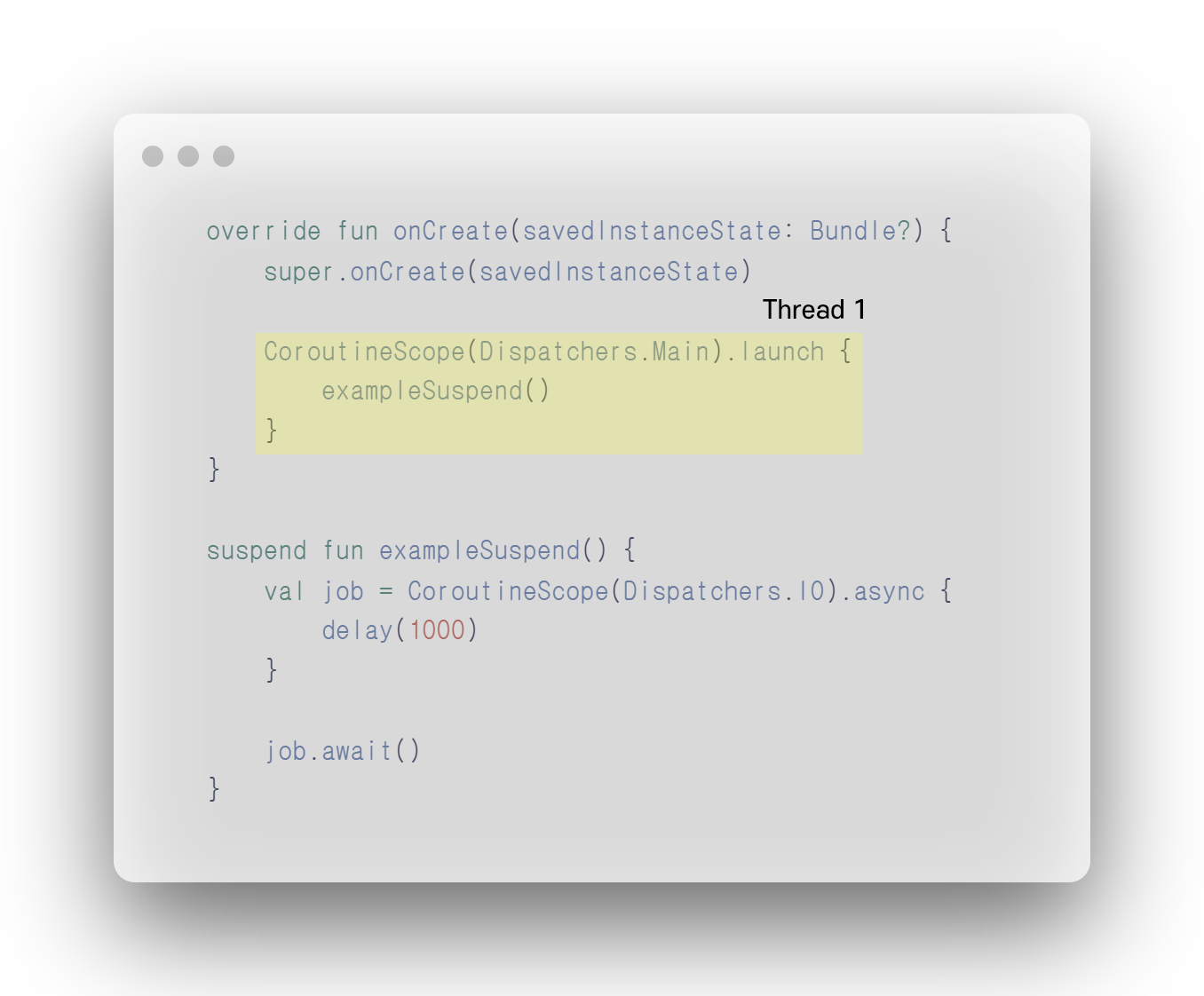 Thread 1은 작업을 수행하다가 일시 중단 함수(Suspend 함수)를 만난다.