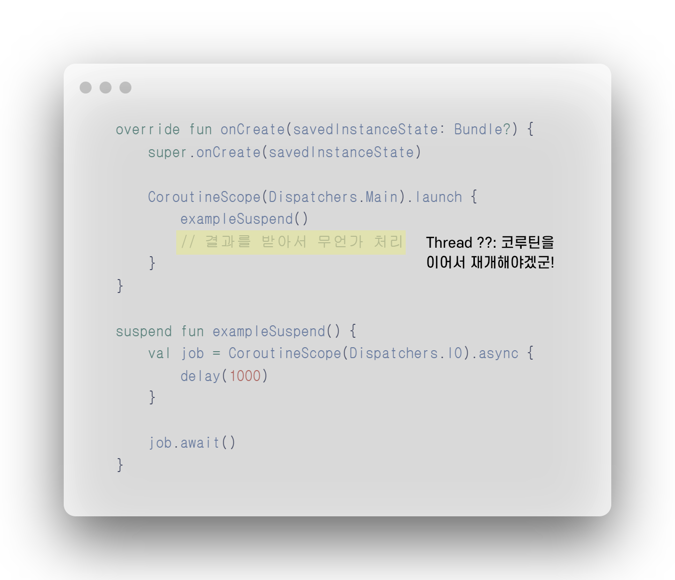 그러면 "아~ exampleSuspend 함수 안에 일시 중단이 가능한 작업이 있구나! 나는 그럼 다른 코루틴 수행하러 가야지~"