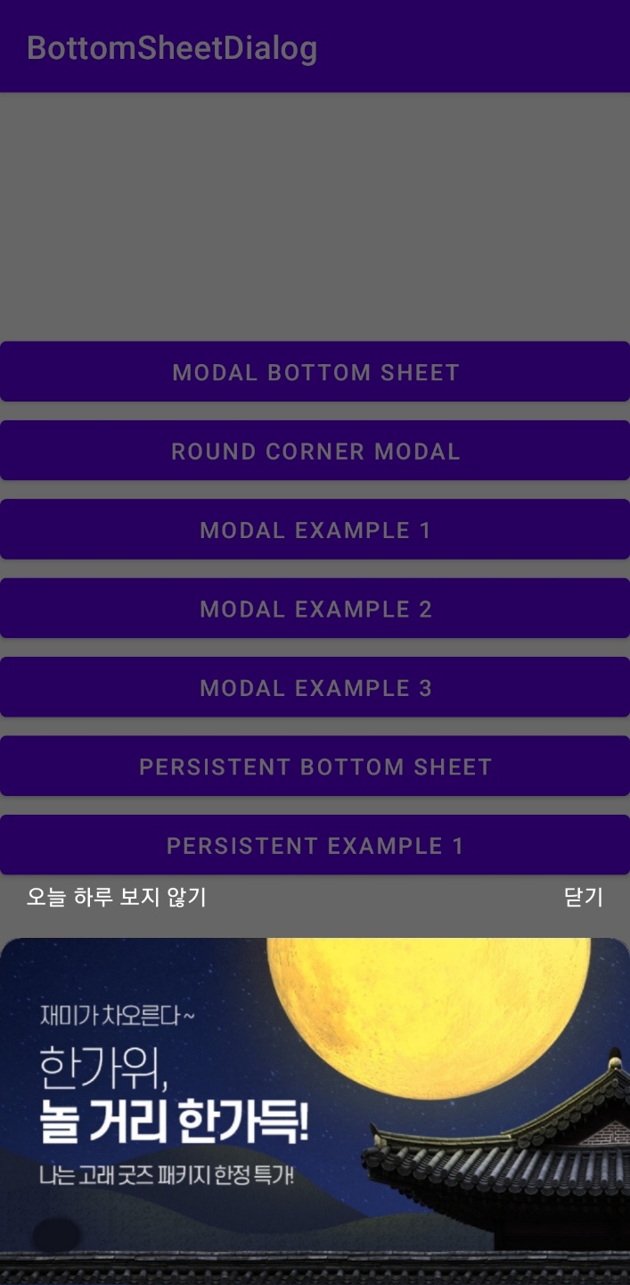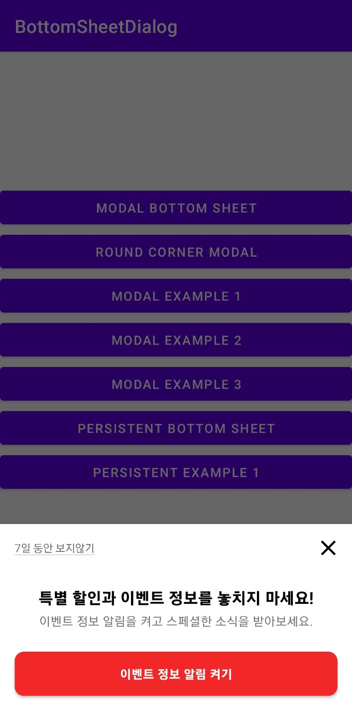 Bottom Sheet Dialog 폴더에서 총 7가지의 예제를 확인하실 수 있습니다!