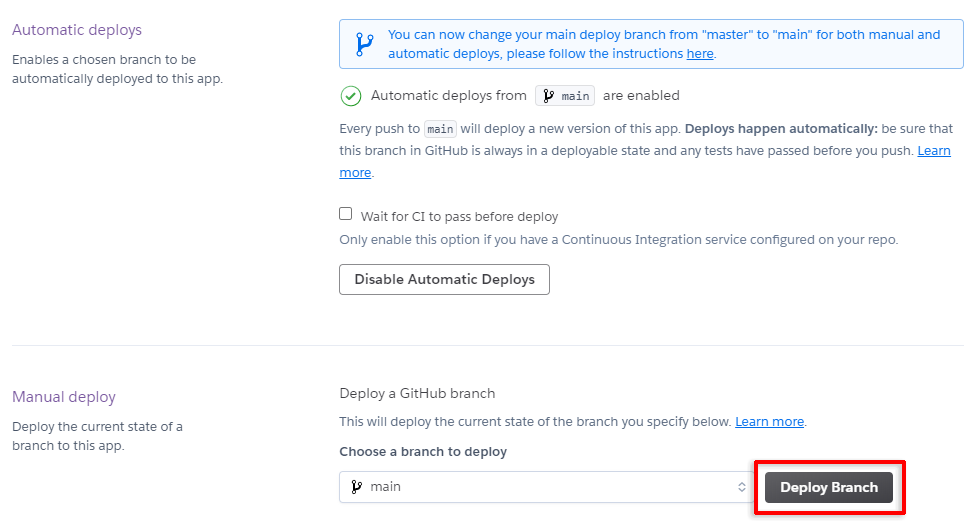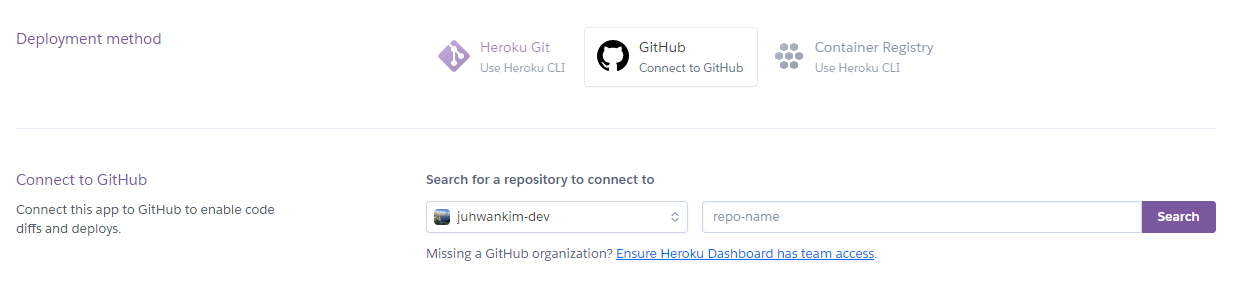 우선 Automatic deploys는 코드를 수정해서 깃허브에 올리면 자동으로 헤로쿠에서 배포까지 해주는 기능이다.