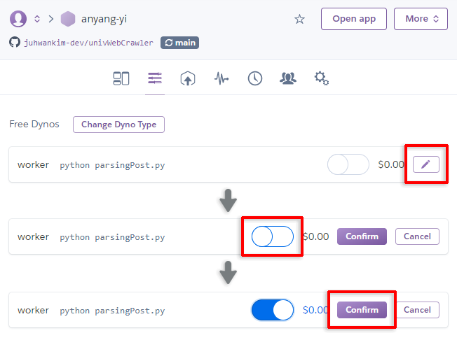 배포를 완료했다면 Overview로 이동해서 Configure Dynos를 클릭하자.