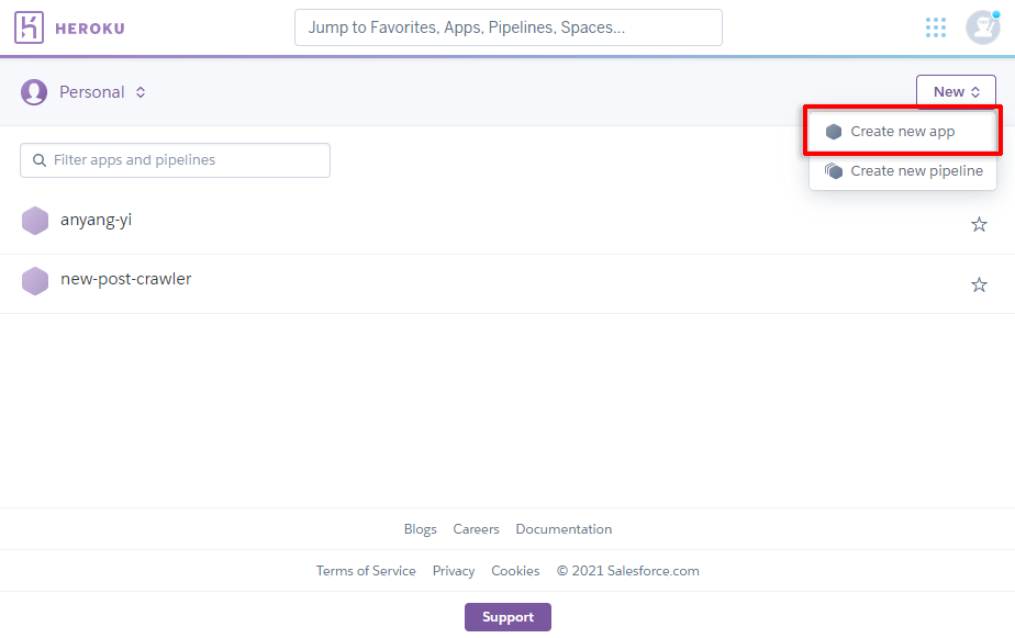 우측 상단의 New - Create new app을 누르면 새로 만들 수 있다.