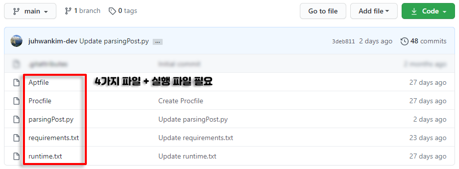 헤로쿠에서 코드를 돌리기 위해서는 4가지의 파일 그리고 실행 파일이 필요하다.