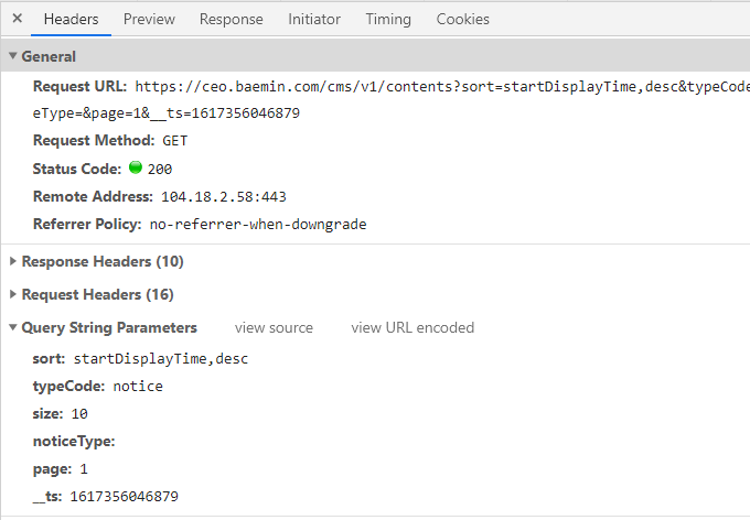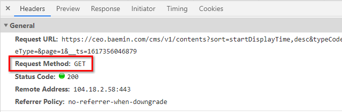 Header에 들어가면 그렇게 찾아 헤매던 Request URL을 알아낼 수 있다.