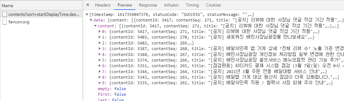 앞서 보여주었던 배달의 민족 사이트가 json 그리고 지금 위에 보이는 사진이 html 형태이다.