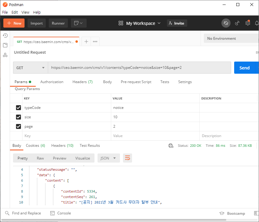 이때 postman을 이용하면 편하다. api를 테스트하는 프로그램이다. request URL을 붙여 넣고 parameter를 하나씩 빼보면서 요청을 보내보면 응답 결과로 필수 파라미터를 구분할 수 있다.