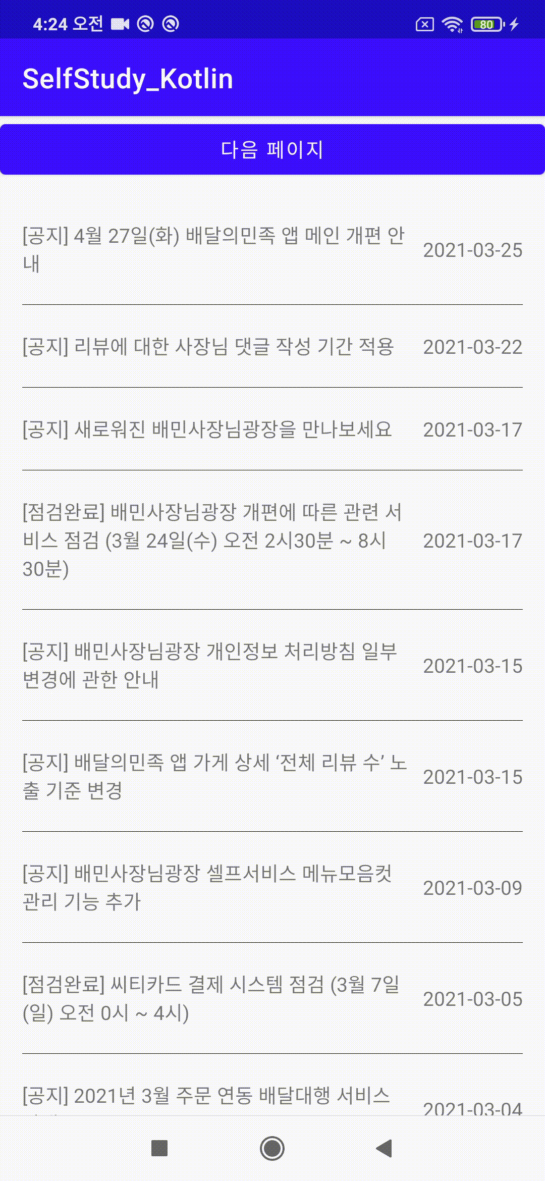 이번 게시물에서는 Retrofit을 이용하여 버튼을 누를 때마다 다음 페이지의 공지사항을 불러와서 띄우는 기능을 구현할 것이다. 사이트는 크롤링을 허용해둔 배민 사장님 광장을 이용하였다.