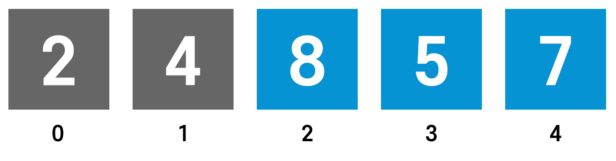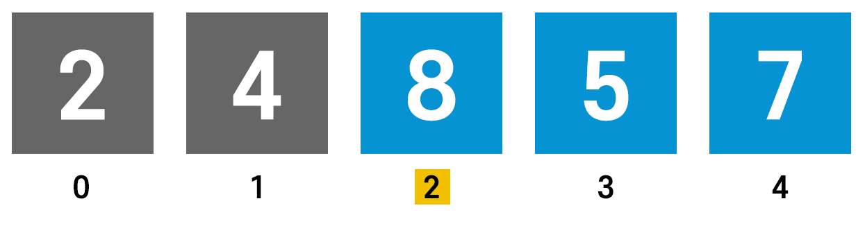 이번엔 8, 5, 7 중에 가장 작은 값을 찾아 2번째 인덱스의 값과 자리를 바꾼다.