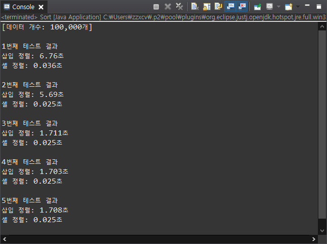 느려 터진 버블, 선택, 삽입 정렬에 비해 셸 정렬이 굉장히 빠르다는 걸 알 수 있었다.