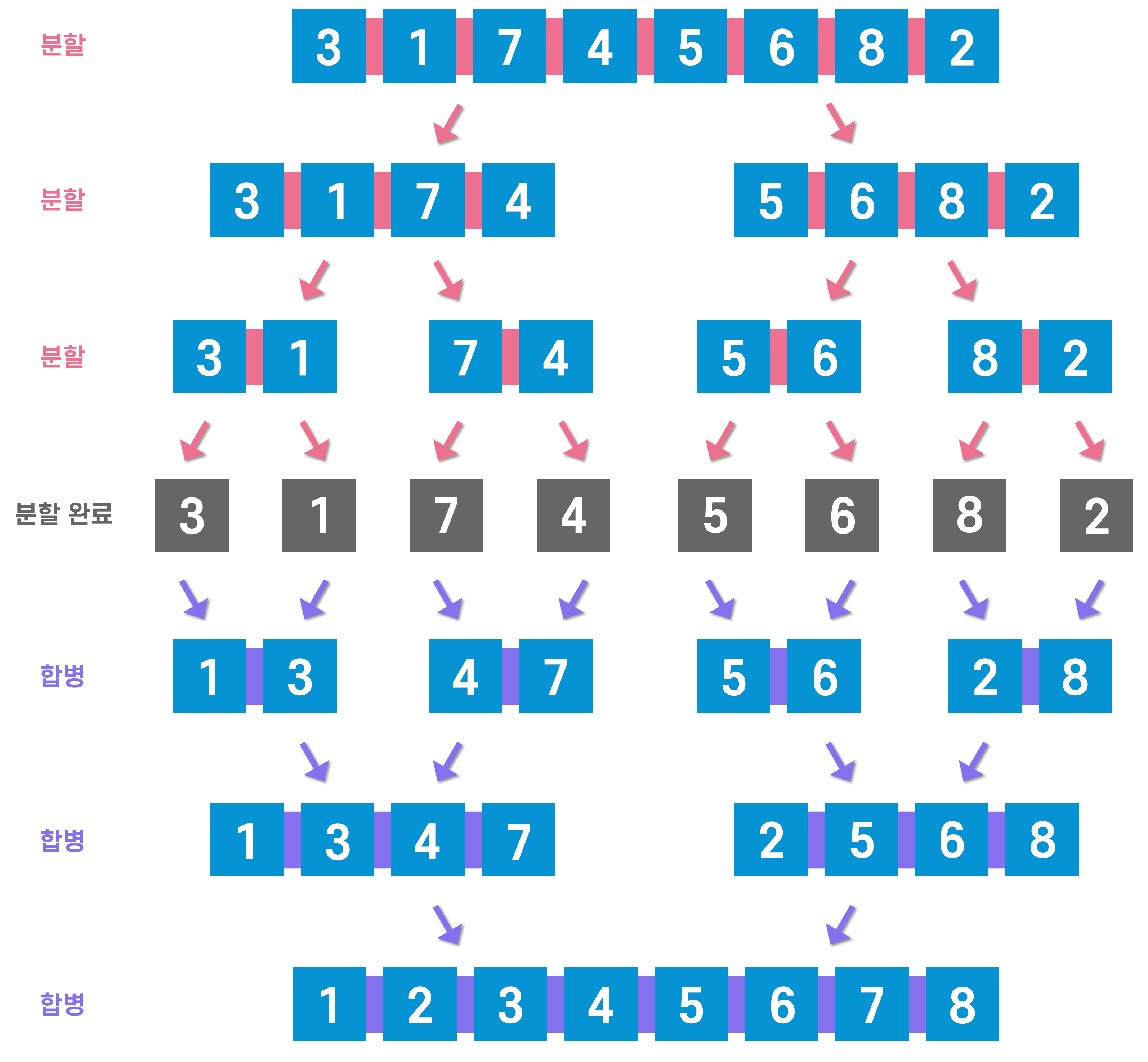 이런 식으로 계속 합병을 해나가면 합병 정렬이 완료된다.