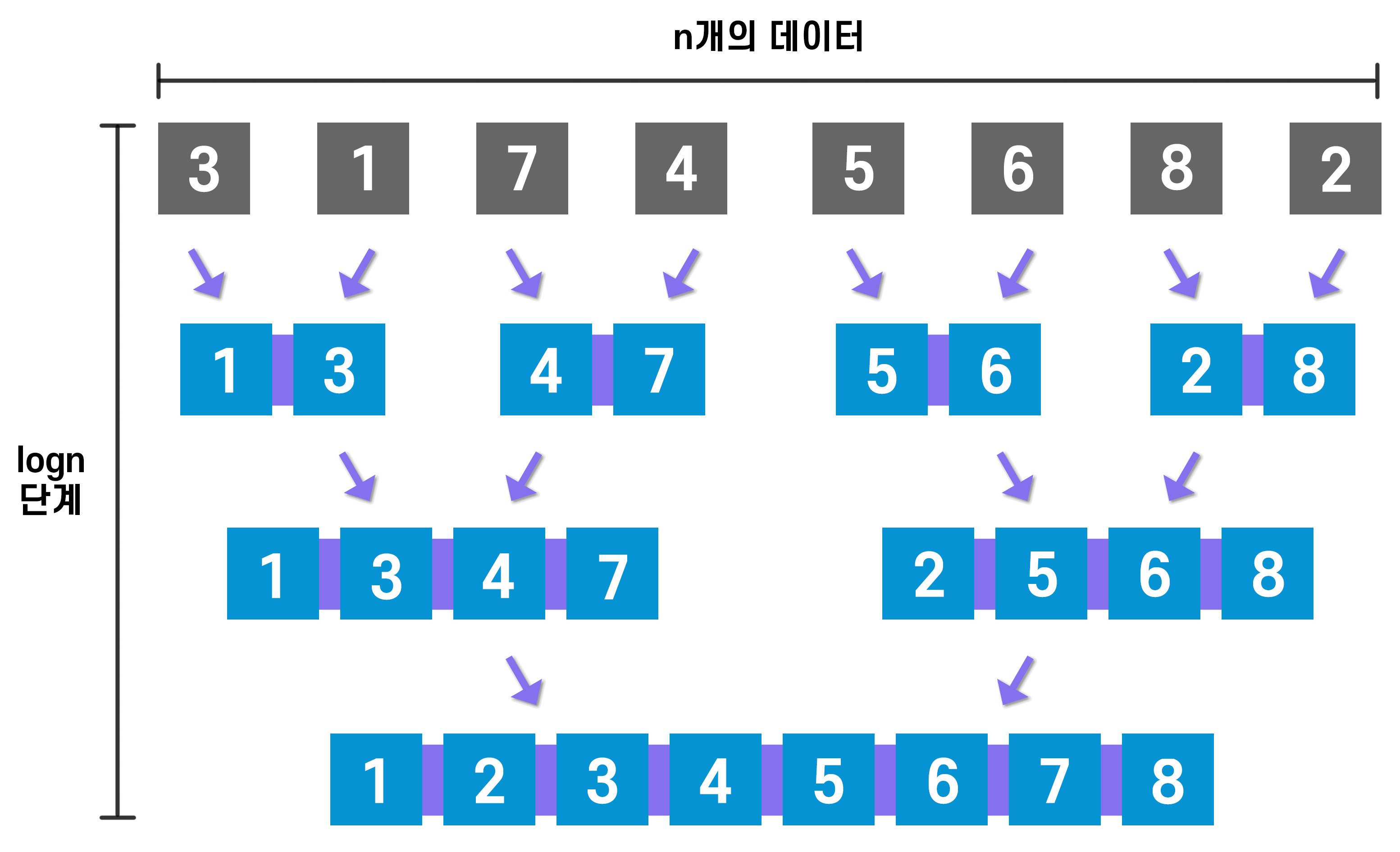합병 정렬의 시간 복잡도는 n개의 데이터를 가지고 logn단계를 거치기 때문에 O(nlogn)이 된다.