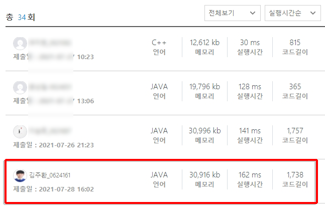 3등이긴 3등인데 실행시간이 굉장히 느리다. (불만족...)