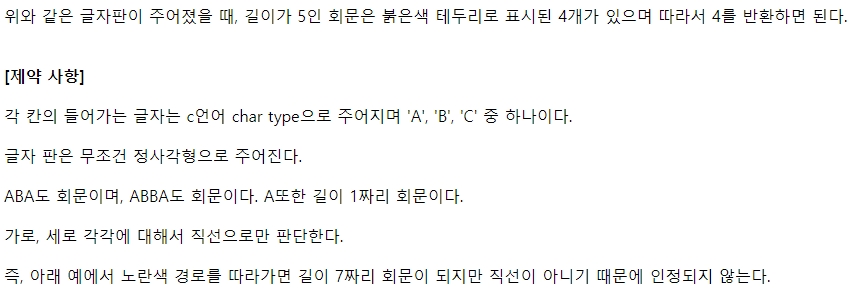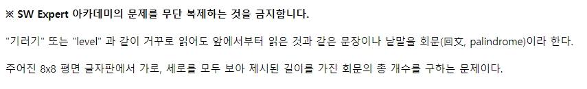 가로 방향으로 이중 포문 한 번, 세로 방향으로 이중 포문 한 번 사용해서 회문을 찾아야 할 것 같지만