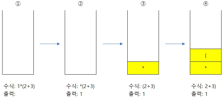 ⑧ 실제로는 닫는 괄호를 스택에 넣지 않지만 시각적인 이해를 위해 추가한 단계이다.