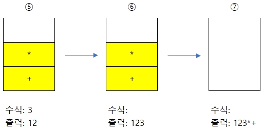 ⑦ [규칙 5]에 의해 스택의 모든 연산자를 pop 해서 순서대로 출력한다.