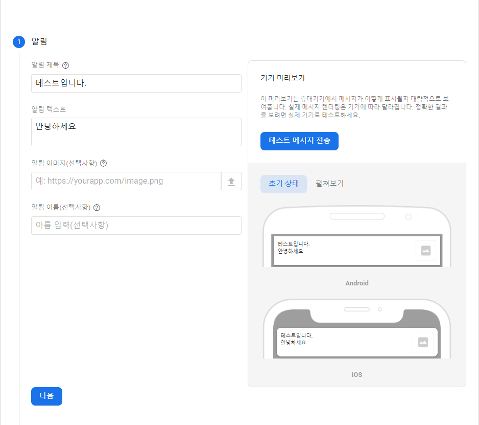 알림 제목과 알림 텍스트를 적고 다음을 눌러준다.