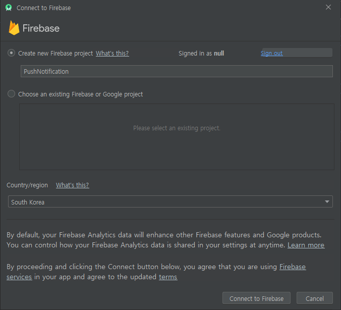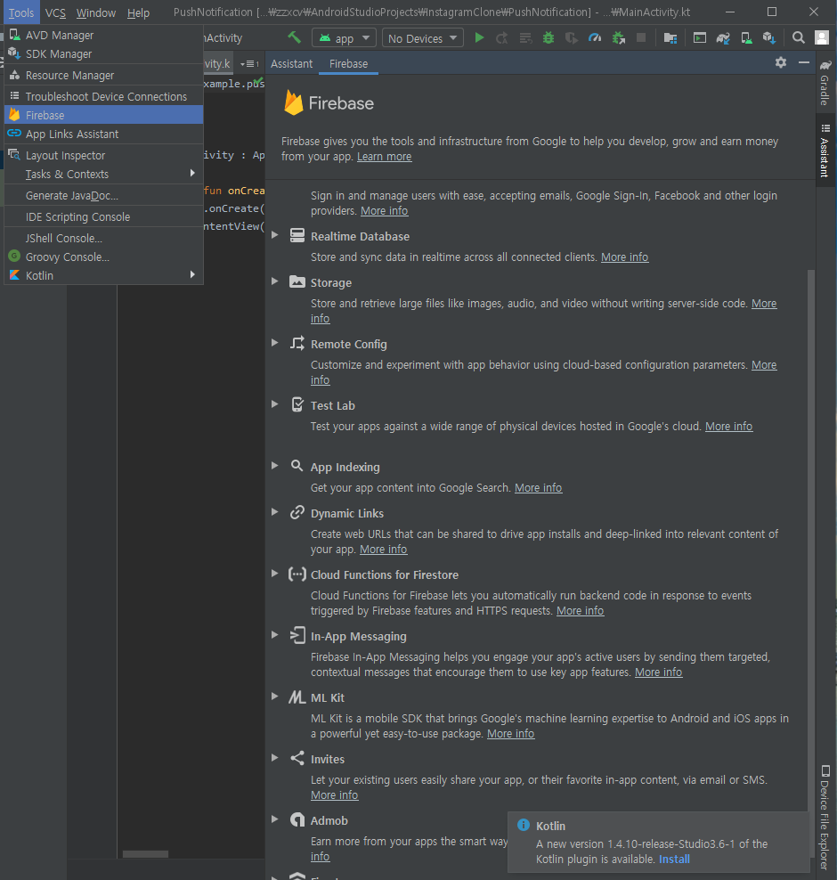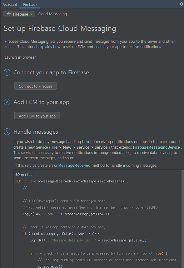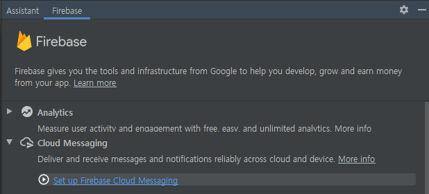 Add FCM to your app을 누르면 자동으로 gradle이 추가된다.