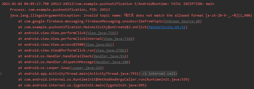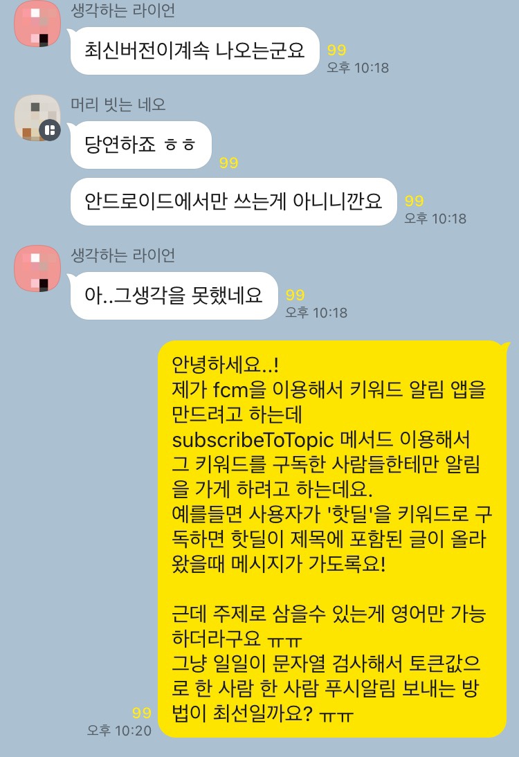 아무튼 이렇게 해서 subscribeToTopic을 한글을 주제로 구독하는 것도 가능하다.