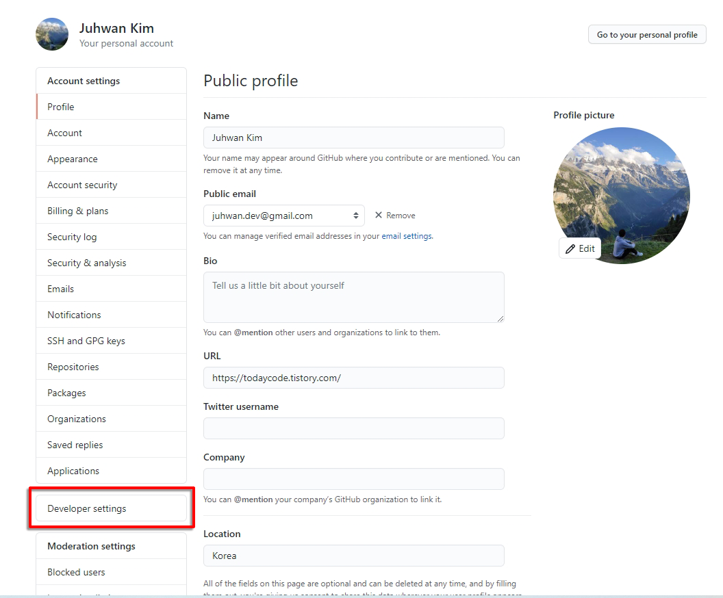 GitHub 홈페이지에 들어가 내 프로필을 클릭하고 Settings에 들어가자.
