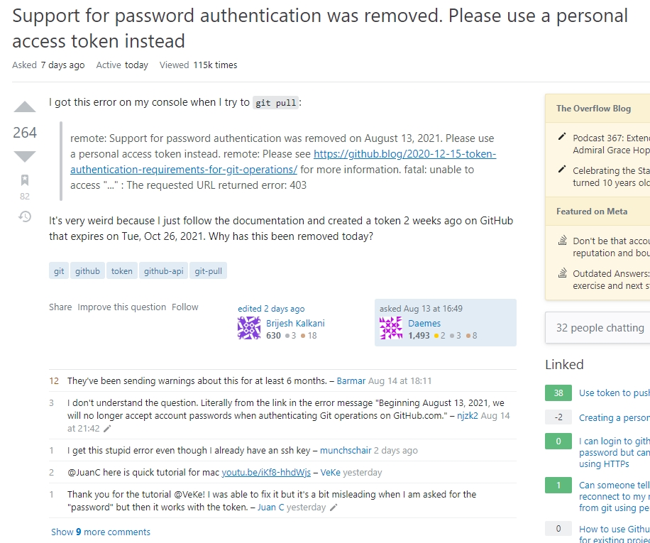 - stack overflow - Support for password authentication was removed. Please use a personal access token instead