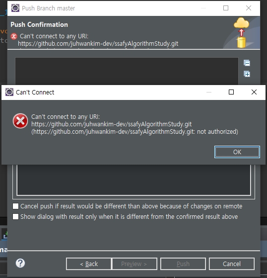 분명 eclipse를 통한 git push를 잘 사용하고 있었는데 오늘 사용하려 했더니 계속 인증 실패가 떴다.